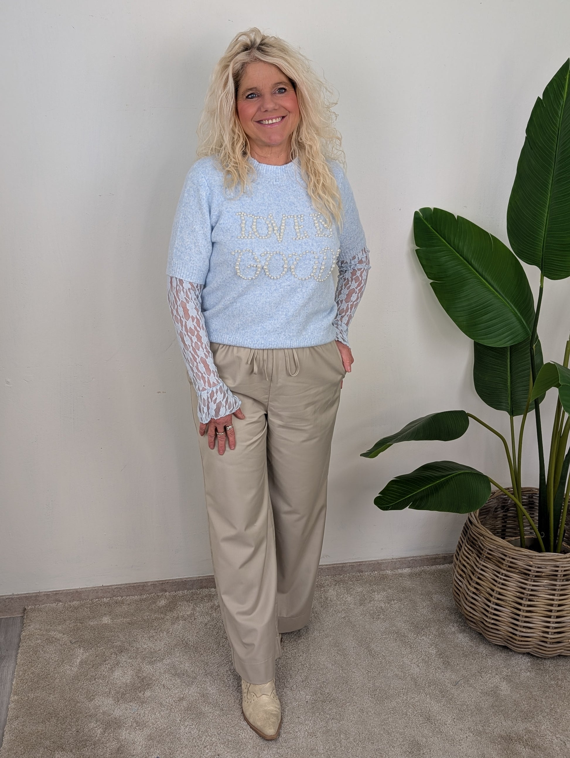 • OMSCHRIJVING: Deze pantalon is gemaakt van een prachtige stof. Valt mooi soepel en recht. De broek heeft koordjes en elastiek in de taille. En mooie steekzakken.