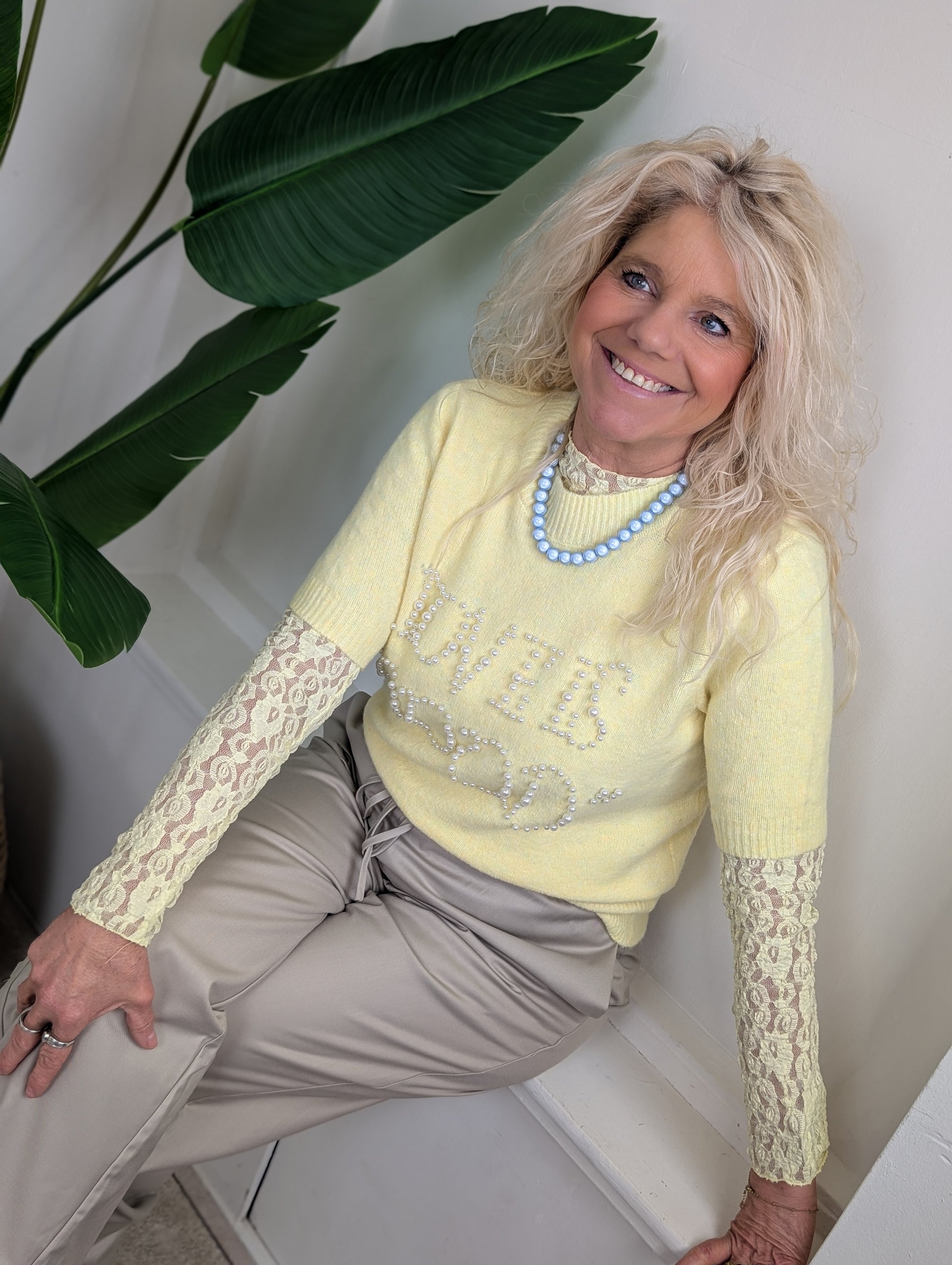 • OMSCHRIJVING: dun gebreid truitje met korte mouwen. Op de trui staan letter gemaakt met parel kralen. Hoe mooi! Ook super leuk voor ergens onder. Ook leuk om er een dun (kanten) truitje met lange mouwen onder te dragen.