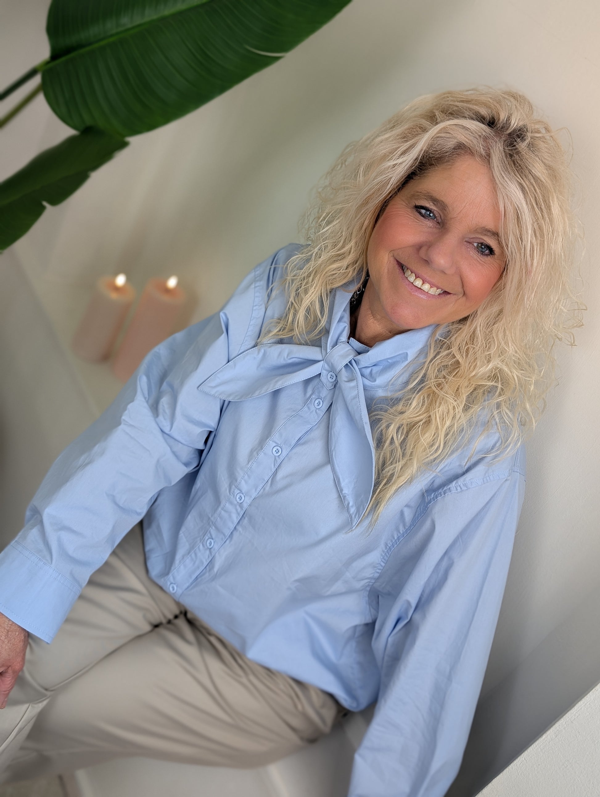 • OMSCHRIJVING: Oversized katoenen doorknoop blouse met een strik detail aan de hals. Hoe leuk!