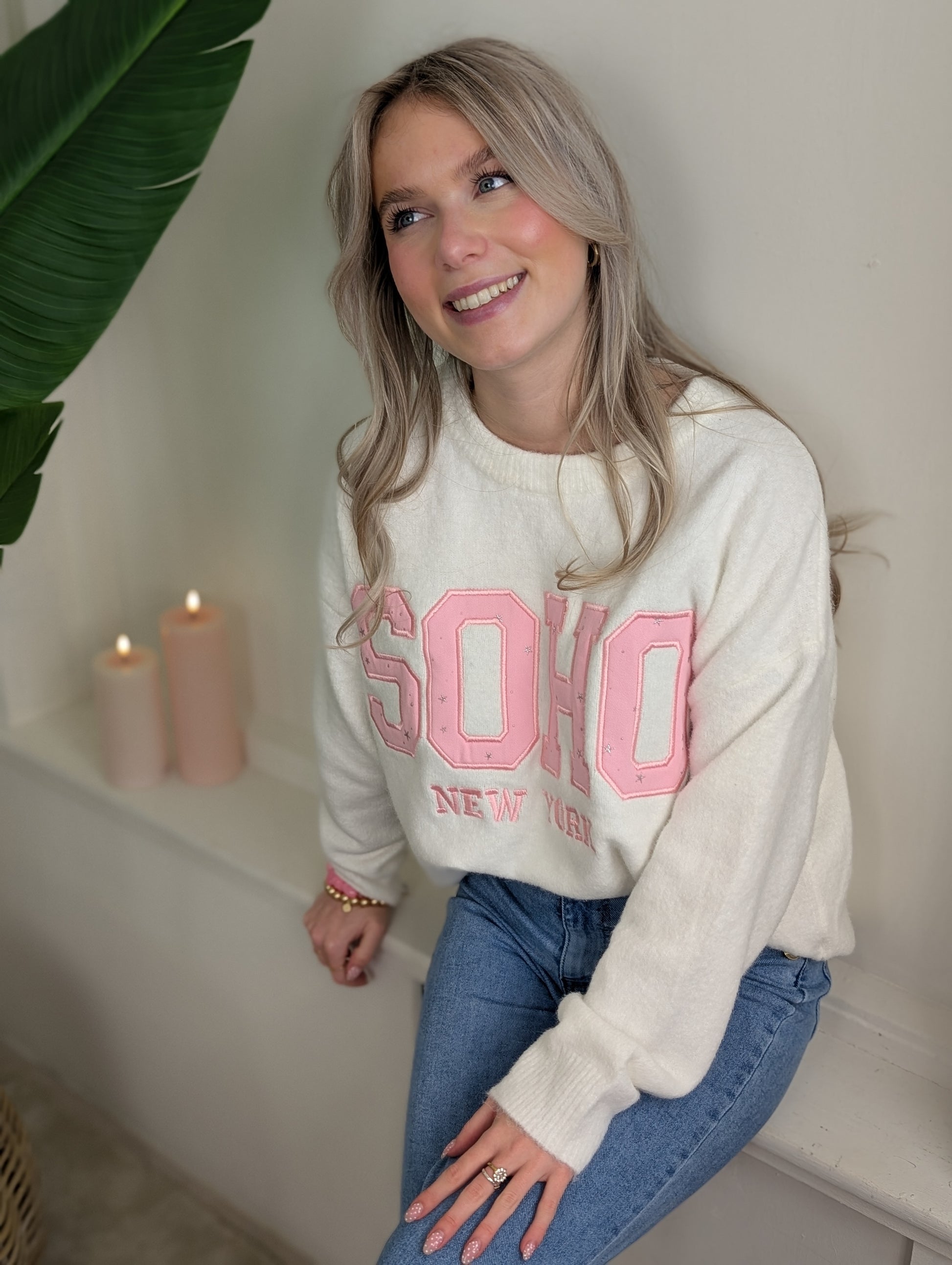 • OMSCHRIJVING: De SOHO truien zijn niet meer weg te denken! En ze blijven leuk. Deze trui is niet al te dik, dus lekker lang door te dragen. Leuk afgewerkt met de letters en fijne zilveren sterretjes op de letters Soho.