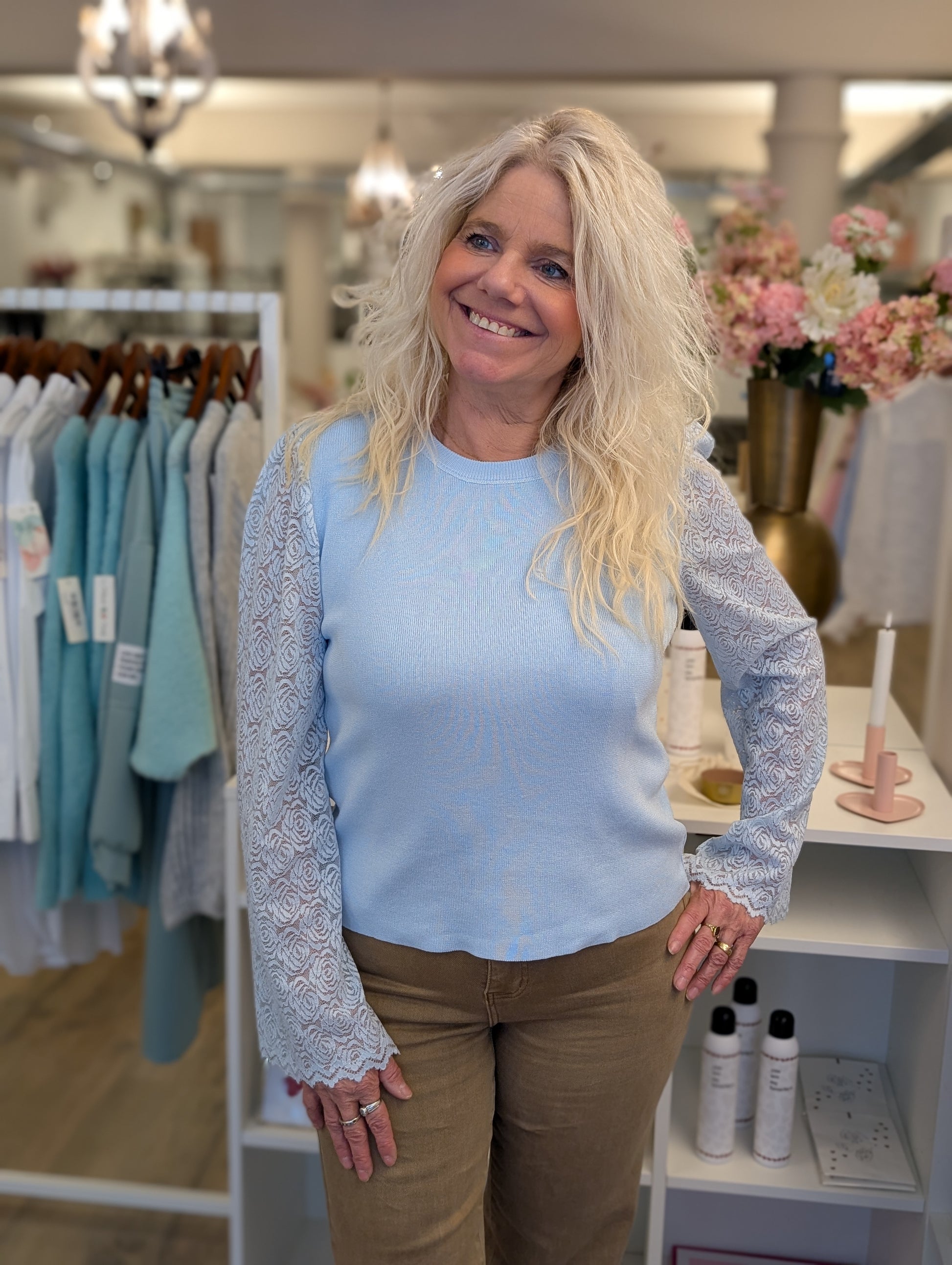 Bibi trui met kanten mouw - Licht blauw