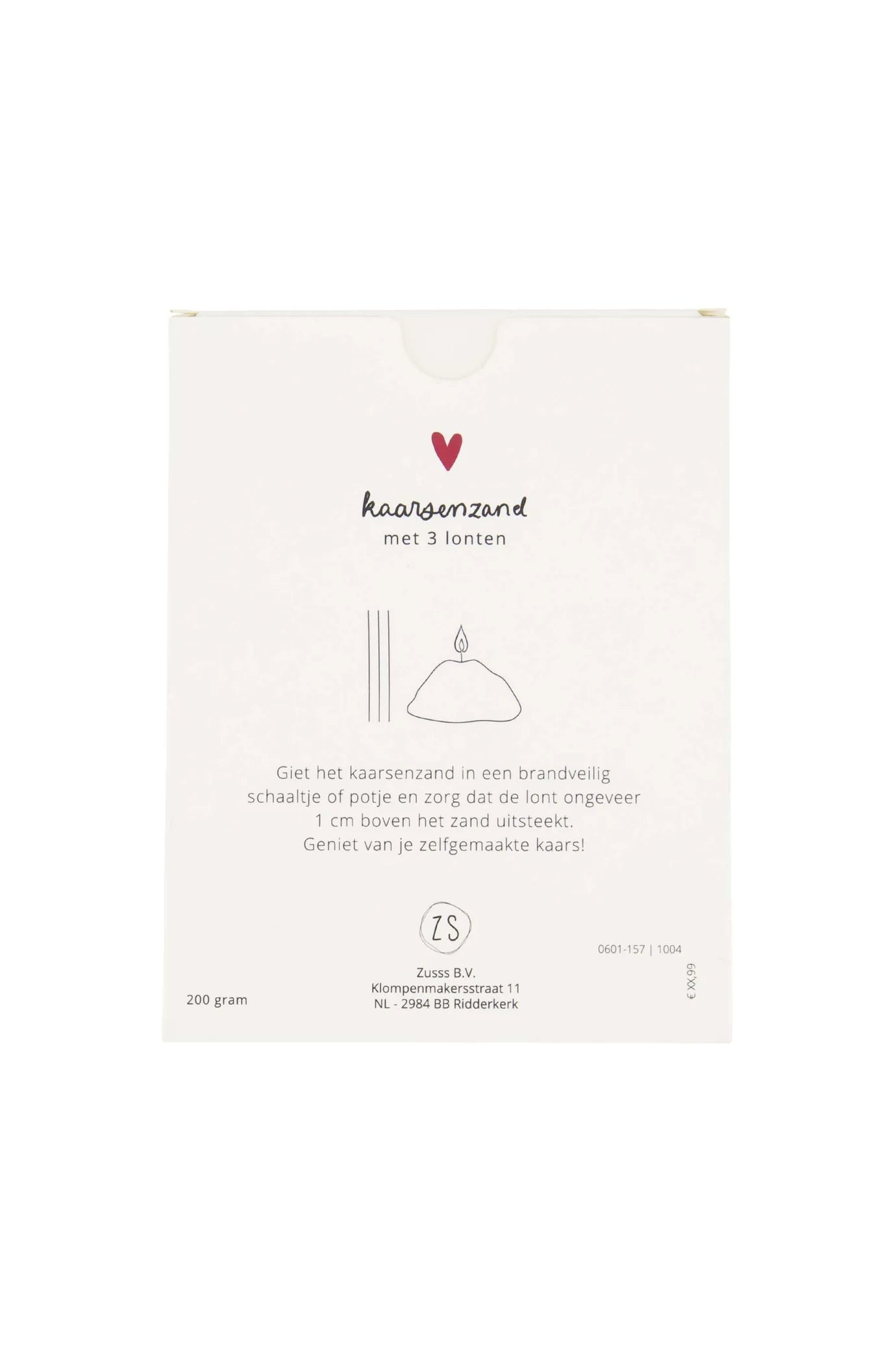 Het Zusss kaarsenzand is ideaal voor een warme sfeer in je woonkamer. Dit kaarsenzand zorgt ervoor dat je kaarsen stevig staan en veilig branden. Het witte kaarsenzand komt in een mooi doosje met een lief hartje, perfect passend bij de Zusss stijl. Gebruik het kaarsenzand om kaarsen stevig te zetten in verschillende houders en creëer een gezellige ambiance. Een subtiele toevoeging uit de wooncategorie die jouw interieur nét dat beetje extra geeft.