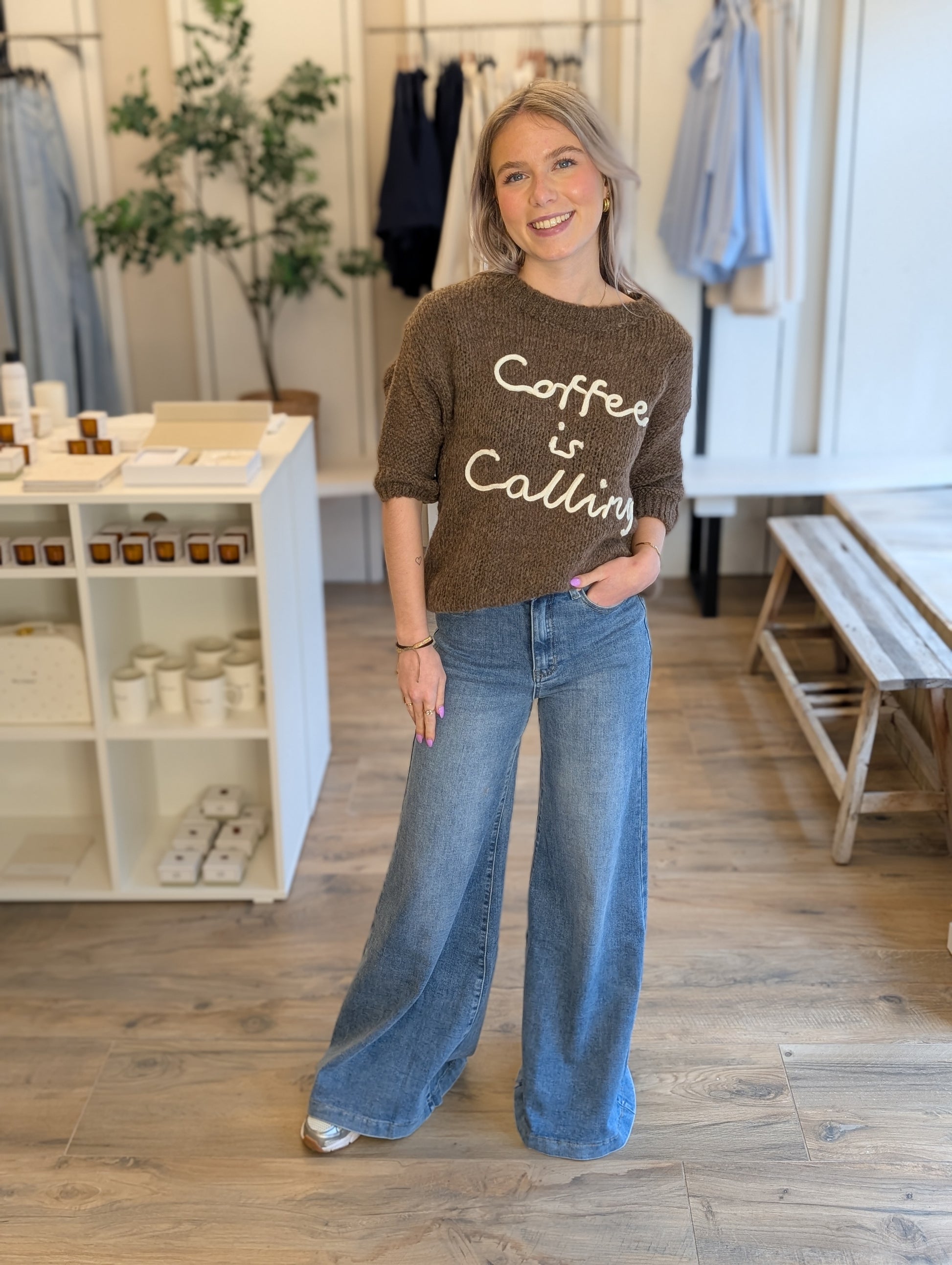 Omschrijving: hoe leuk is deze trui met de tekst Coffee is calling.