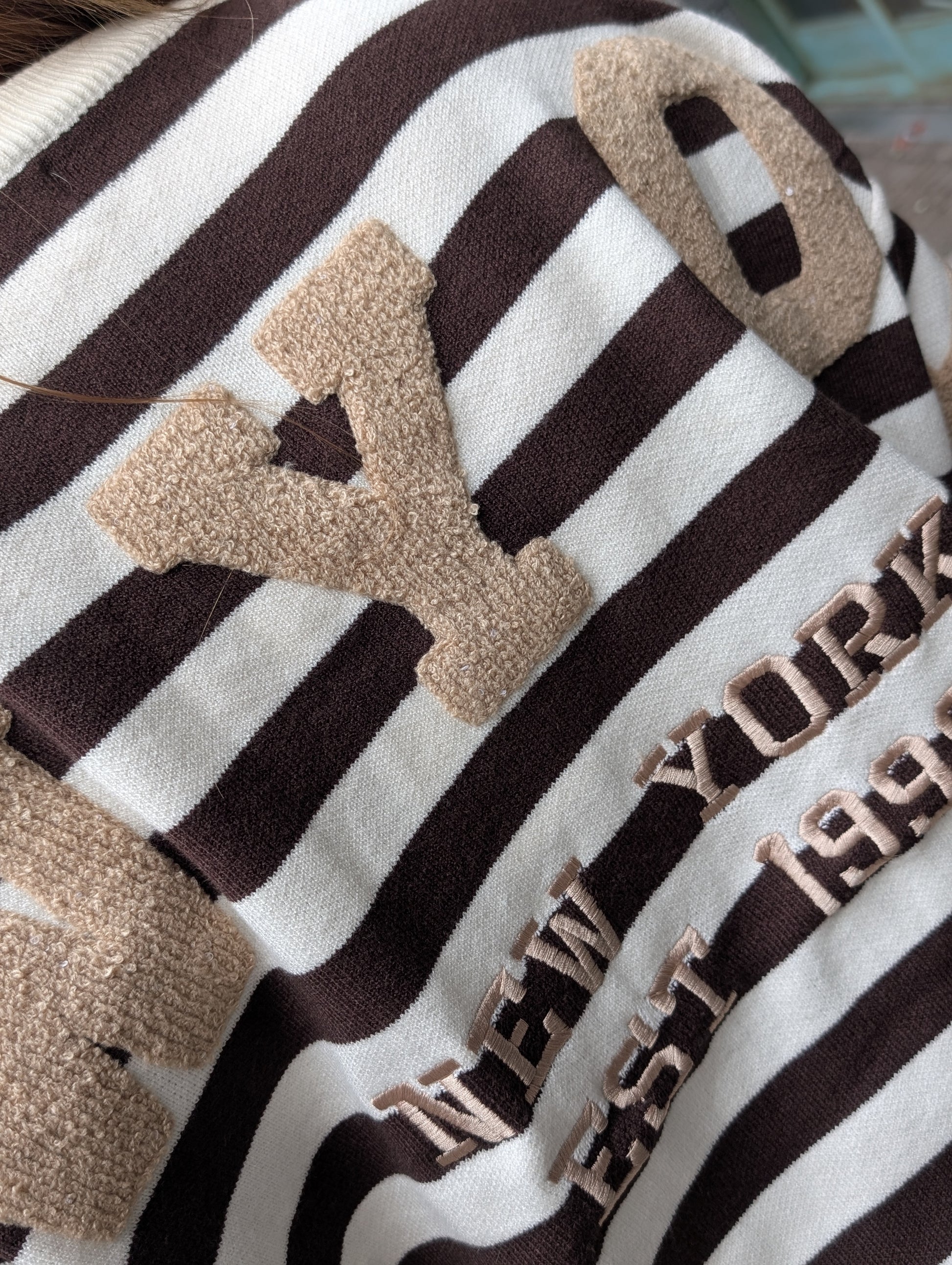 De New York sweaters zitten weer in onze collectie. Deze keer zijn ze leuk gestreept met beige kleurige teddy letters.