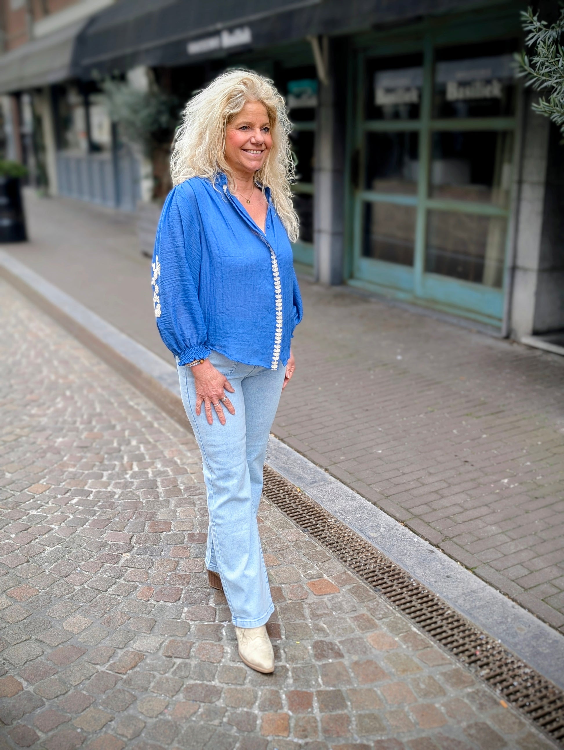 Deze blouse valt lekker luchtig en losjes. Heel leuk model! Ruime mouw afgewerkt met elastiek. Perfect voor als het warmer is. En mooie geborduurde details.