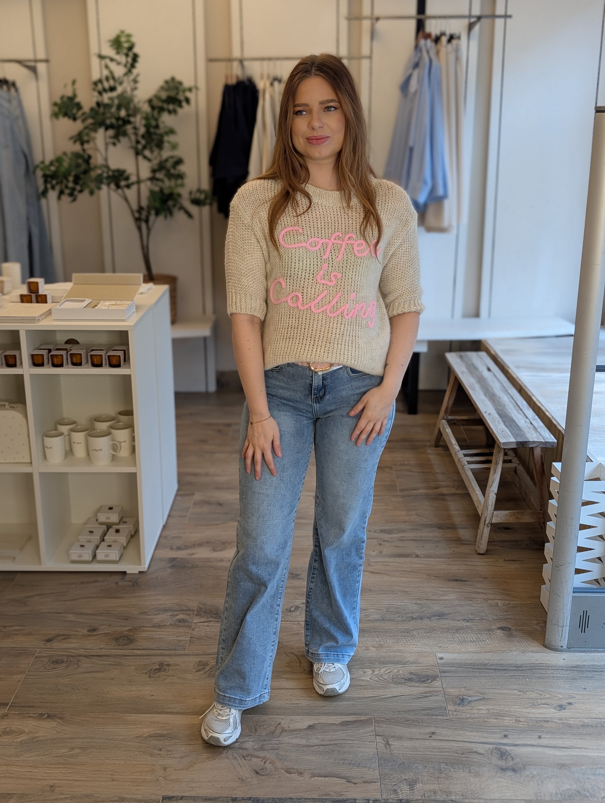Omschrijving: hoe leuk is deze trui met de tekst Coffee is calling.