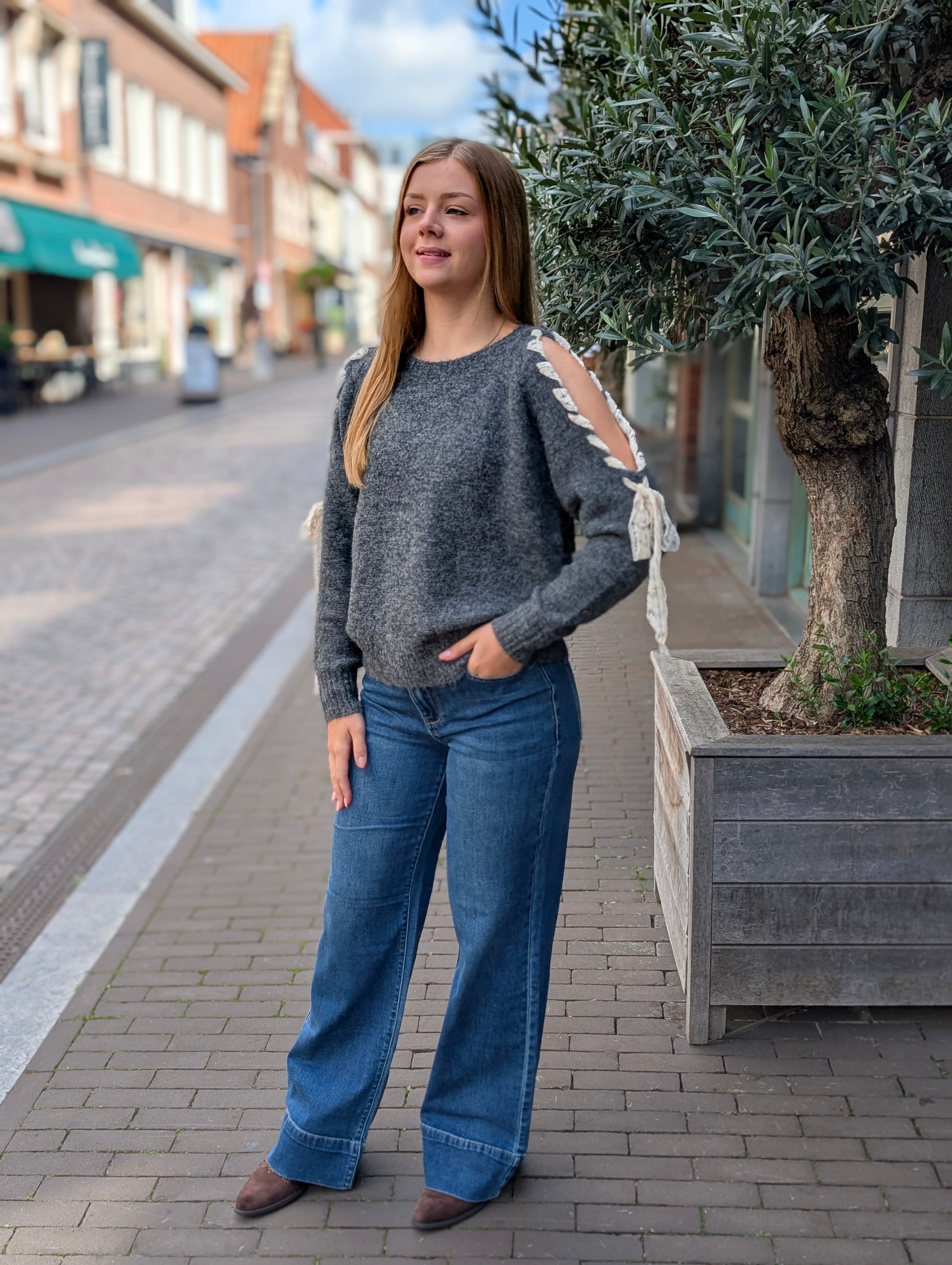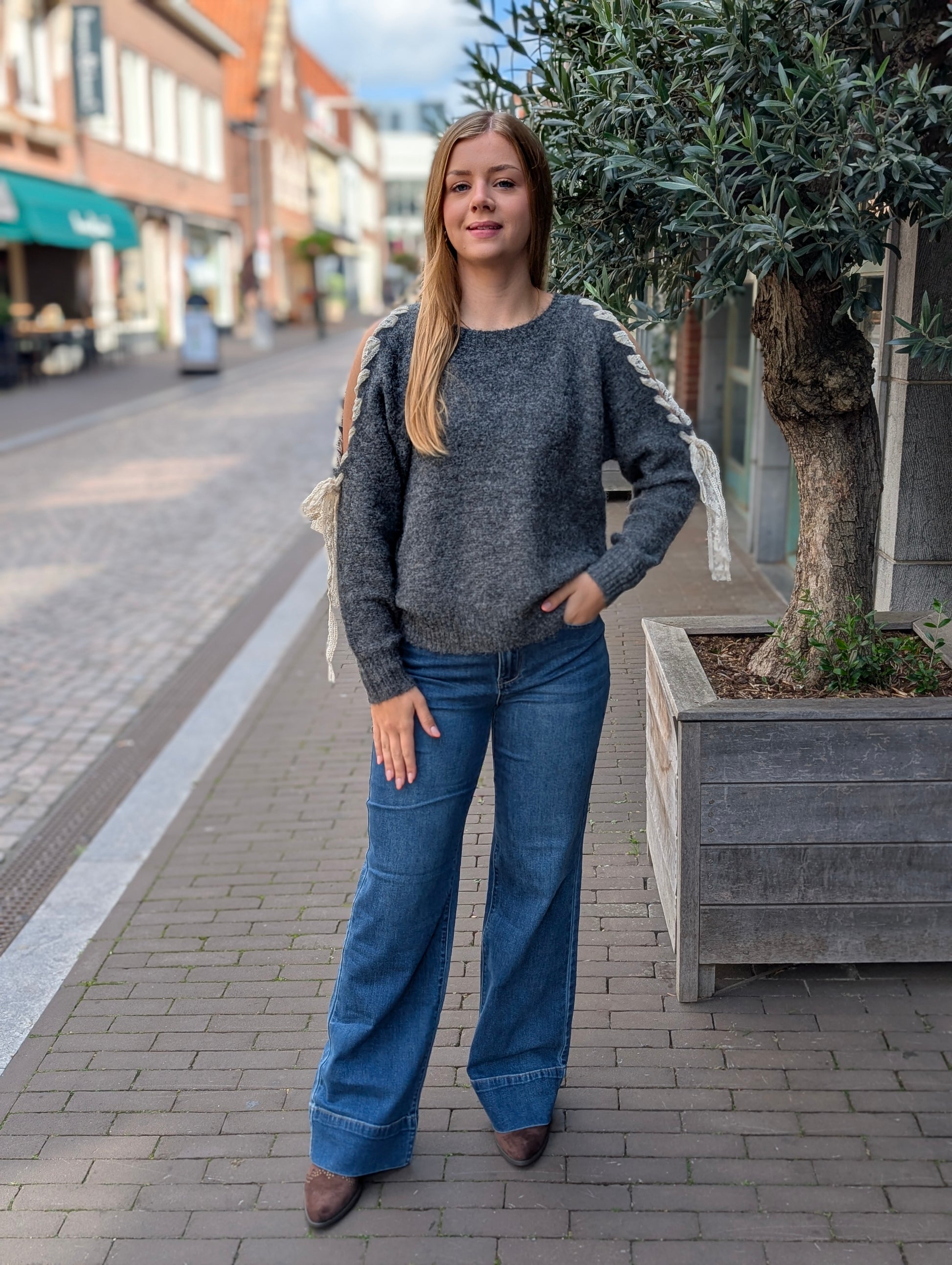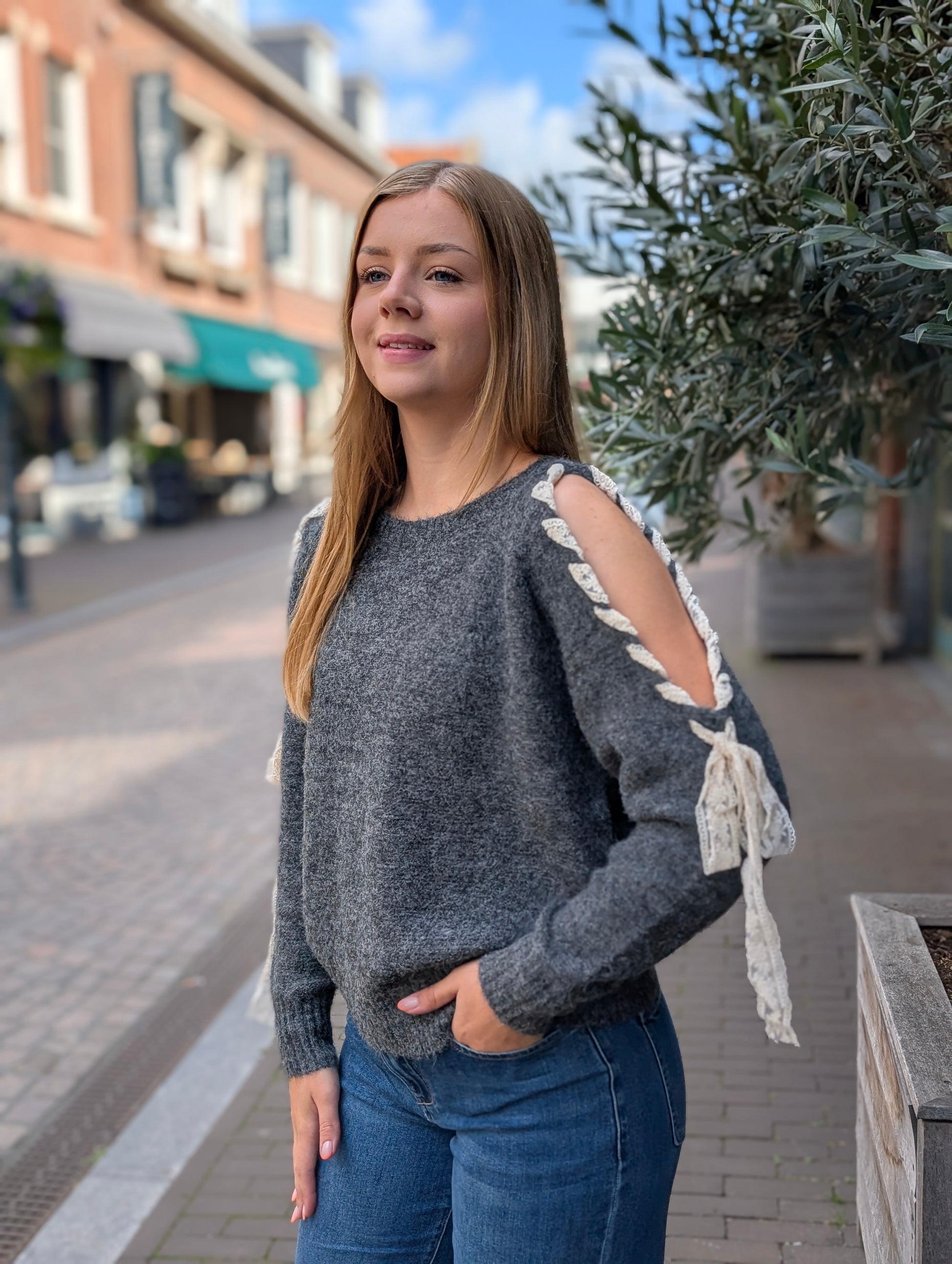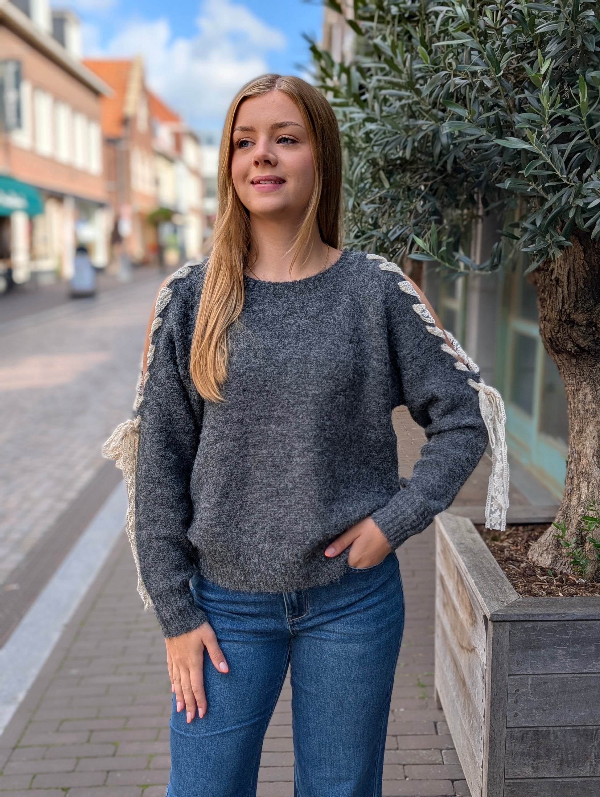 Nana trui met opengewerkte mouw - Antraciet met ecru kant