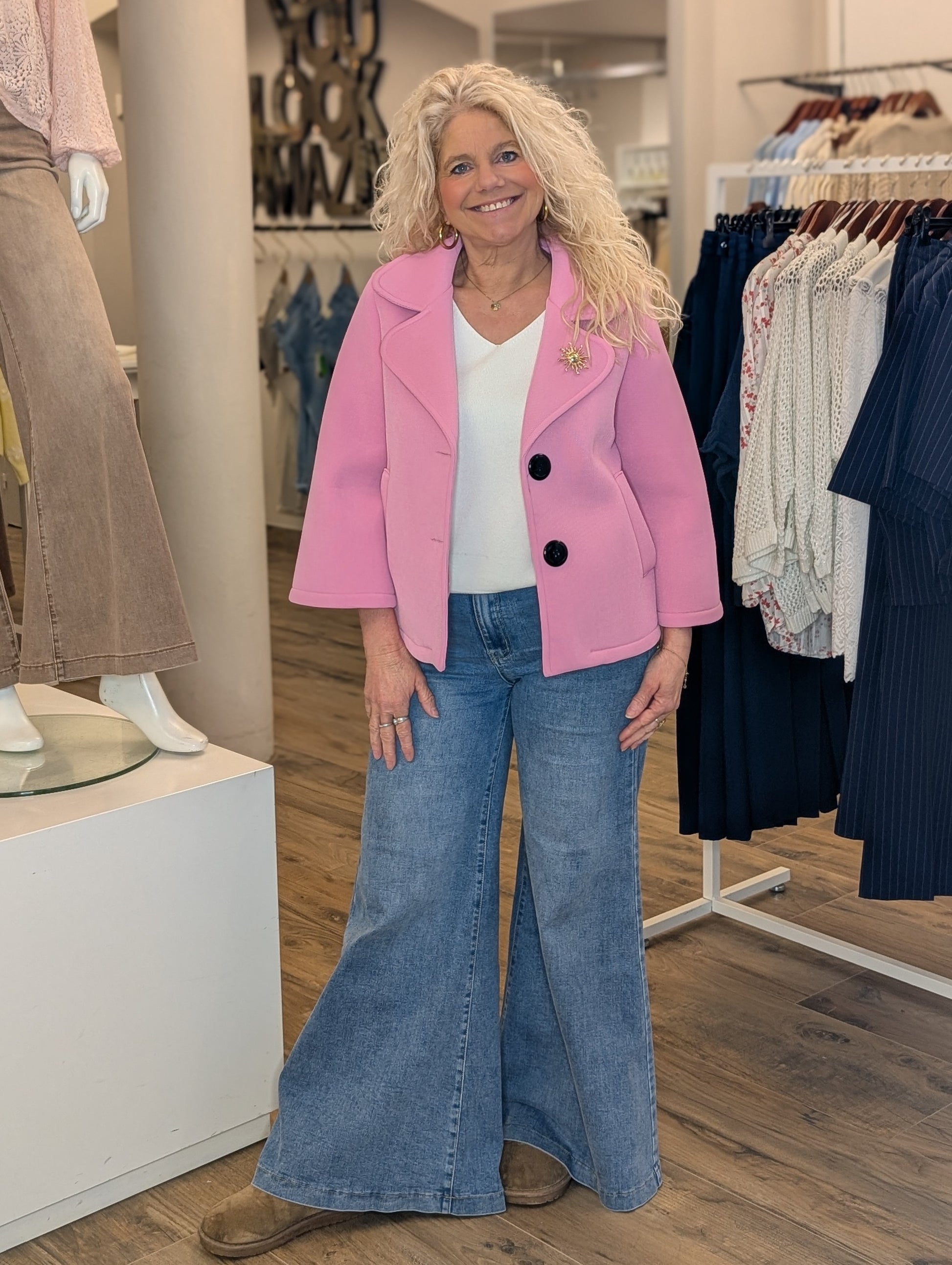 Omschrijving: Deze scuba jas is de ideale tussenjas. Met leuke grote zwarte knopen, steekzakken en een broche (deze kan eraf).