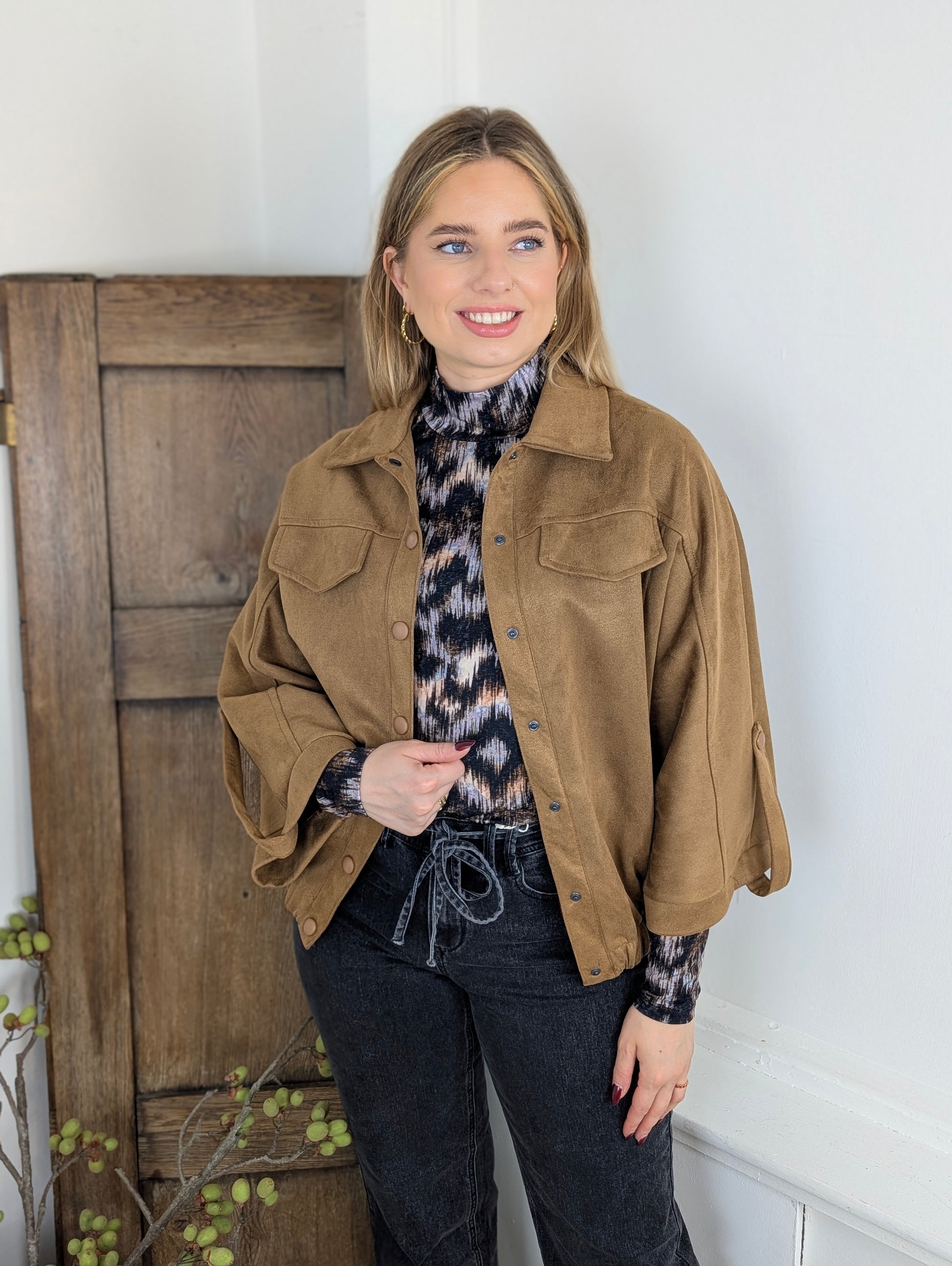 Suede ga je weer heel veel zien dit seizoen. Natuurlijk 100%Vegan suede. Dit modelletje valt wat rechter en heeft een laag ingezette ruime 3/4 mouw. Elastiek aan de onderkant, steekzakken voor en drukknopen.