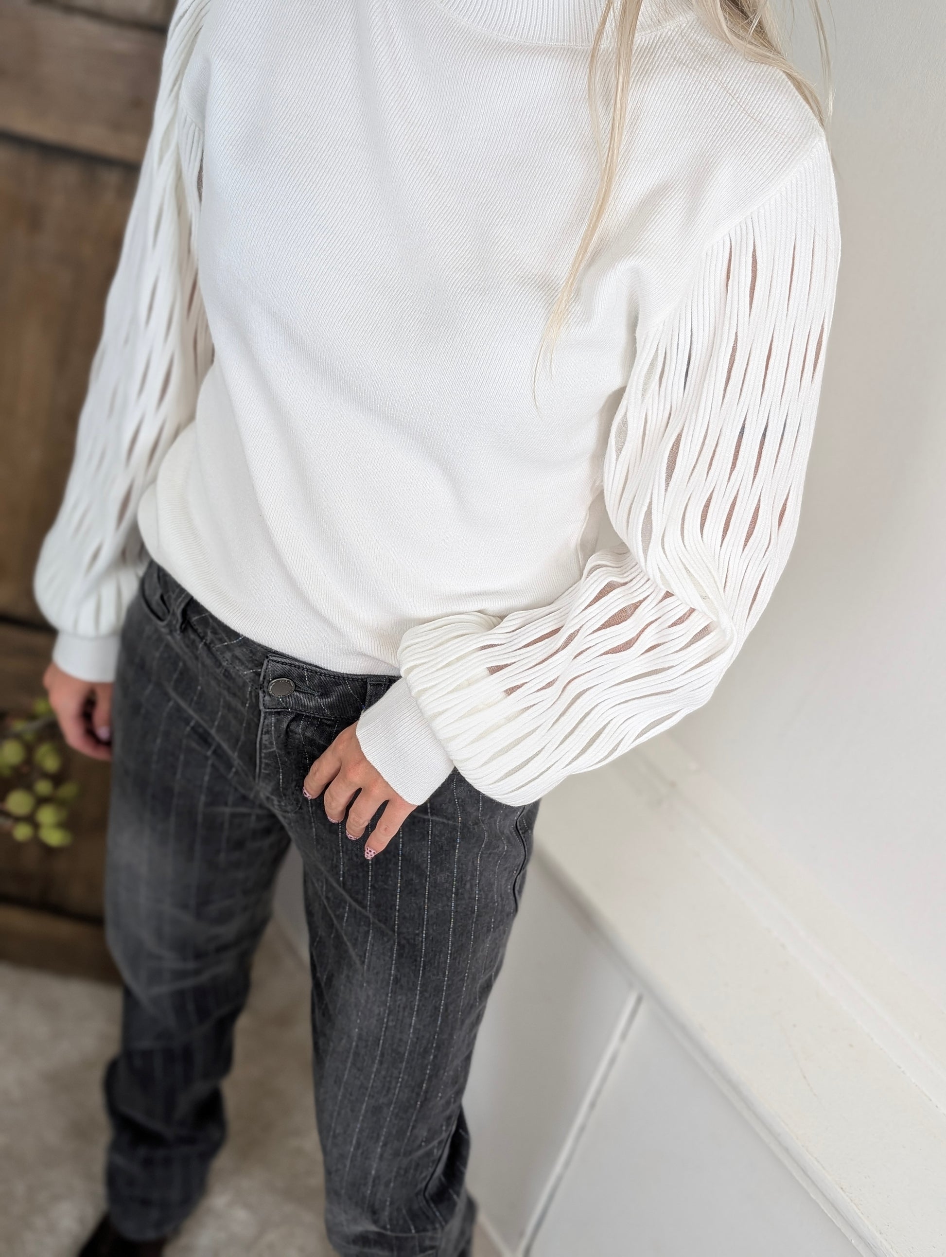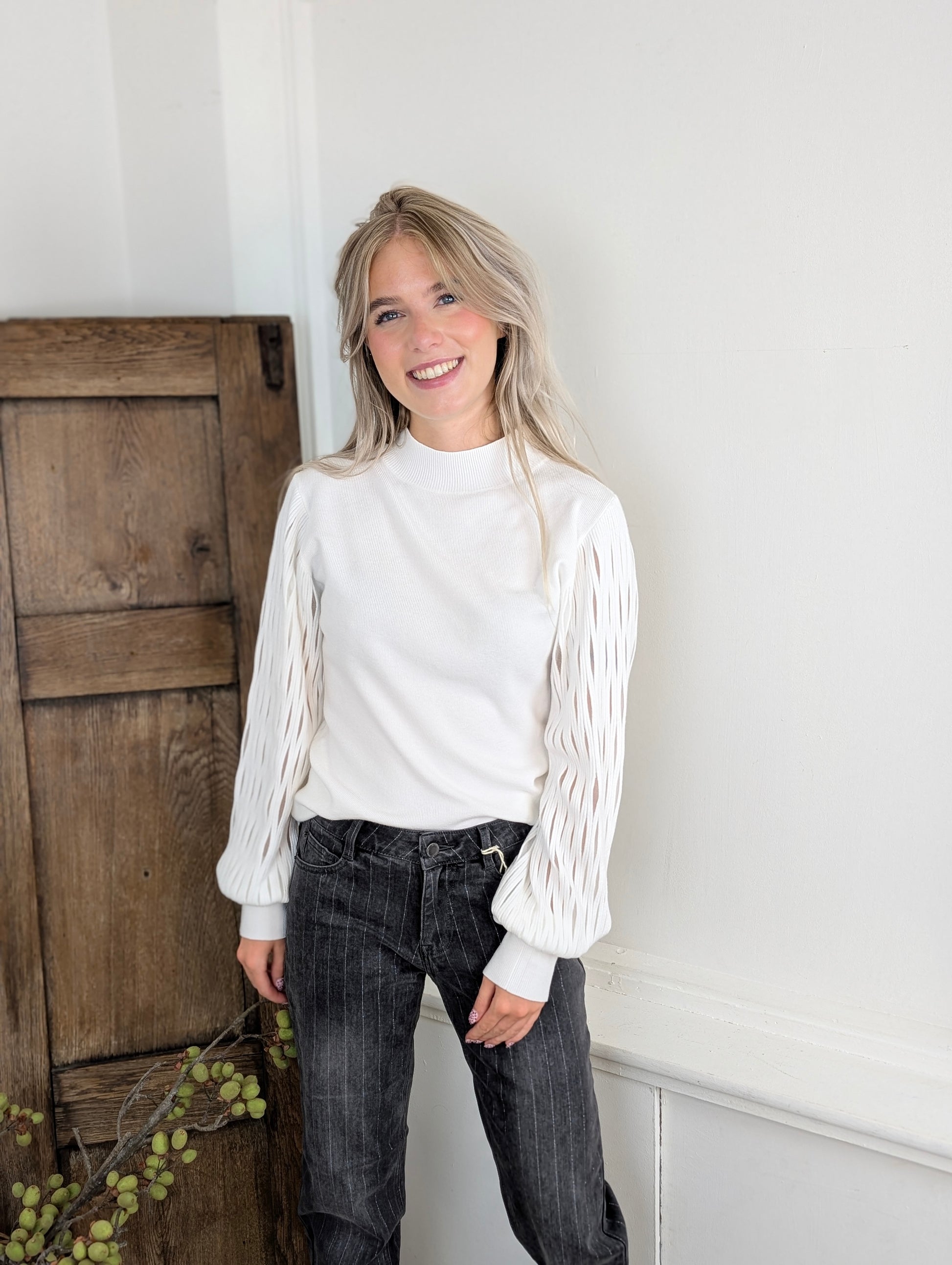 Deze trui komt elk jaar weer terug in onze collectie! En blijft een hardloper. Maar we snappen het helemaal! Deze leuke trui is al heel erg leuk van zichzelf door de leuke mouwen, Draag je er een giletje over is het ook erg leuk! De mouwen zijn semi transparant.