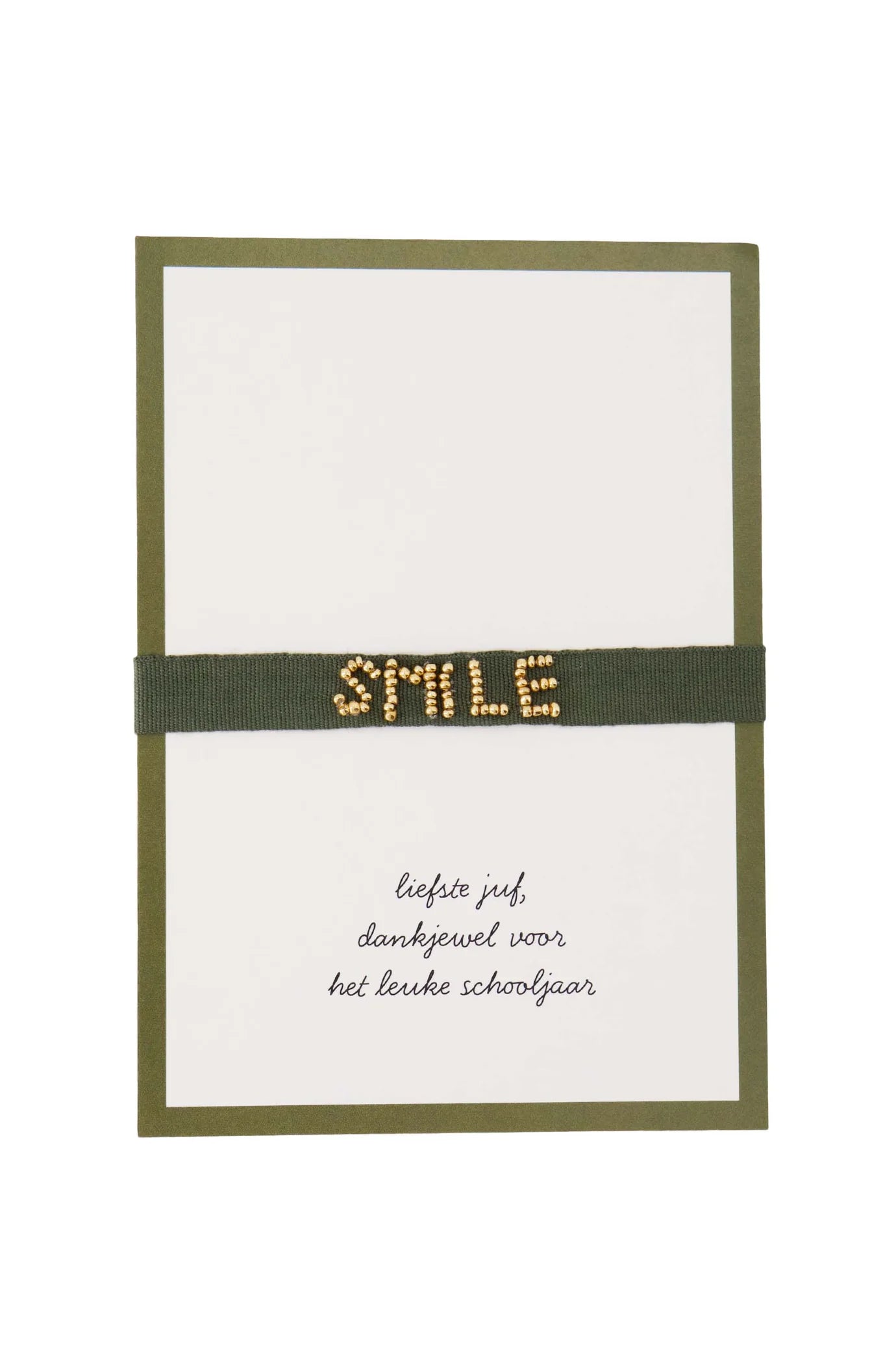 De Zusss ansichtkaart armbandje liefste juf is een bijzonder bedankje dat laat zien hoeveel je een juf waardeert. Deze ansichtkaart met armbandje combineert een zachte groene kleur met een subtiel armbandje, waaraan het woord 'SMILE' is bevestigd met fijne gouden kralen. Dit maakt de ansichtkaart armbandje liefste juf niet alleen mooi om te geven, maar ook om te dragen en te koesteren. Een warm en persoonlijk gebaar aan het einde van een fijn schooljaar, perfect om een juf te verrassen met iets dat opvalt en betekenis heeft.
